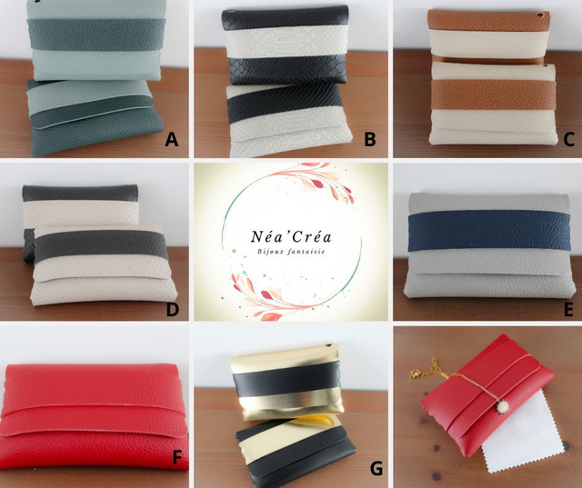 1 pochette en simili cuir (format CB) – Idéale pour ranger le bijou ou de petits trésors – Fermeture élégante, toucher doux grainé, réversible – Coloris au choix : rouge, noir-blanc, marron-beige, bleu-gris, doré-noir, vert, gris-blanc.